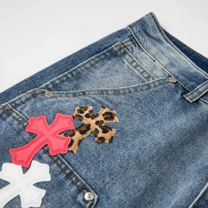 Description: Each pair of Chrome Hearts jeans is a work of art steeped in a gritty, high-fashion aesthetic. With iconic details like custom crosses and unique leather patches, these jeans are a statement of fearless individuality and raw attitude. Whether you pair them with a simple tee or a bold jacket, these jeans will be the perfect finishing touch, helping you dominate the street style scene and capture every eye.